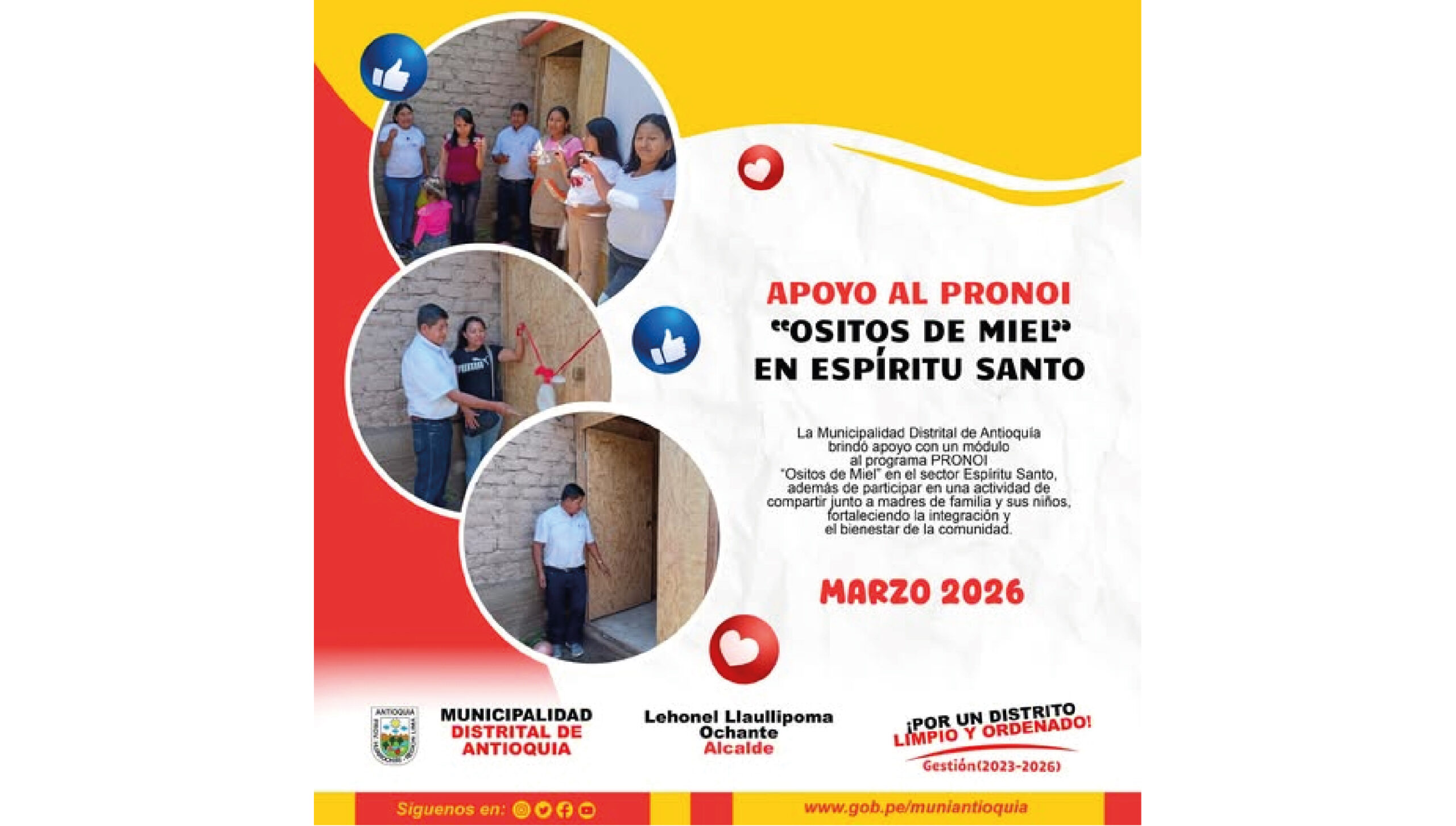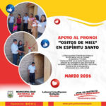 Actividades y Noticias ¡Apoyo al Pronoi “Ositos de Miel”! marzo 26, 2026 Posted by leonid 23 Mar Se brindó apoyo con un módulo al PRONOI “Ositos de Miel” en Espíritu Santo y se participó en un compartir junto a madres y niños de la comunidad. #Antioquía #ApoyoSocial #PRONOI #Gestión20232026 #TrabajandoPorElPueblo