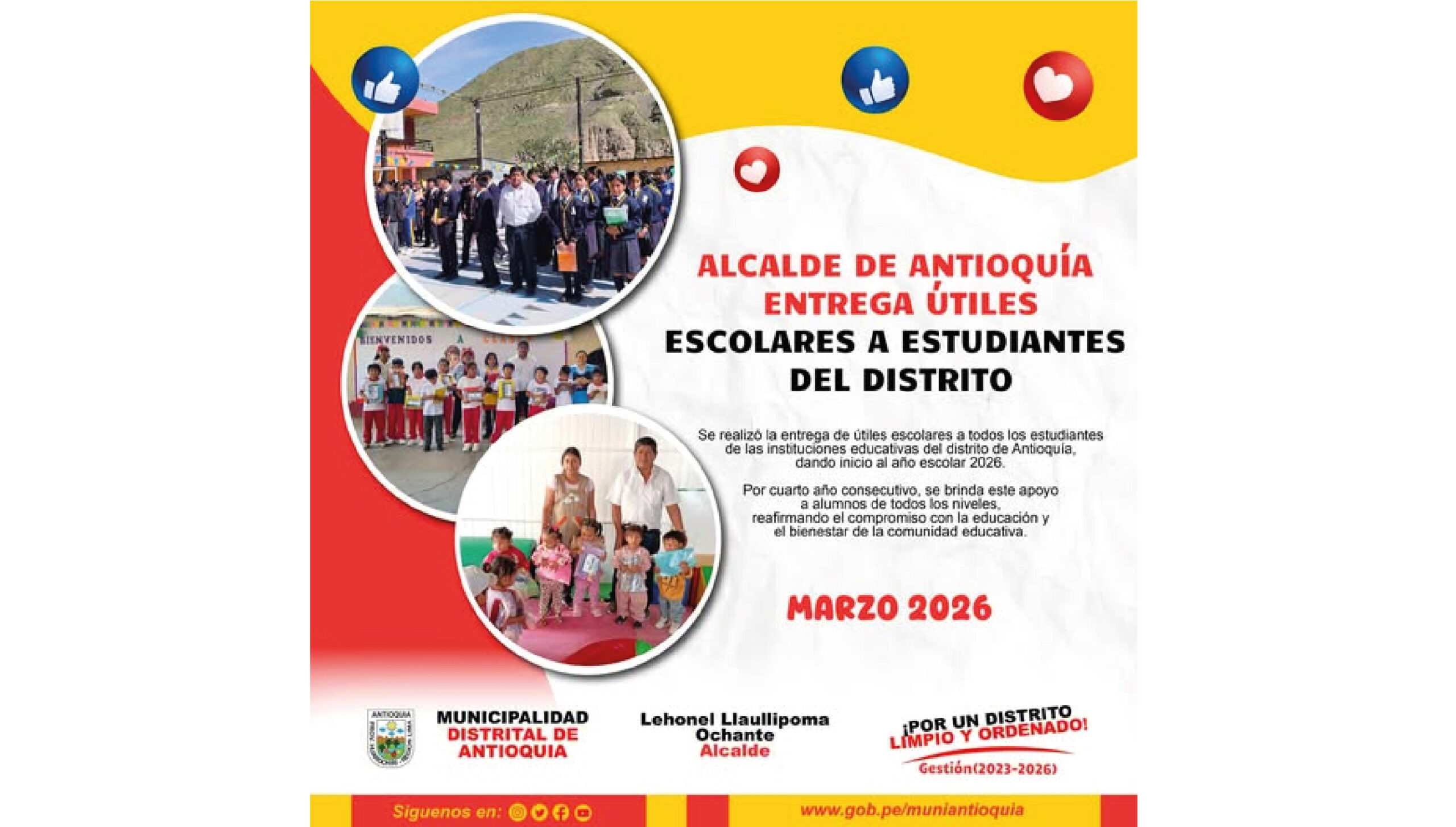 En el marco del buen inicio del año escolar 2026, se realizó la entrega de útiles escolares a estudiantes de todas las instituciones educativas del distrito de Antioquía.