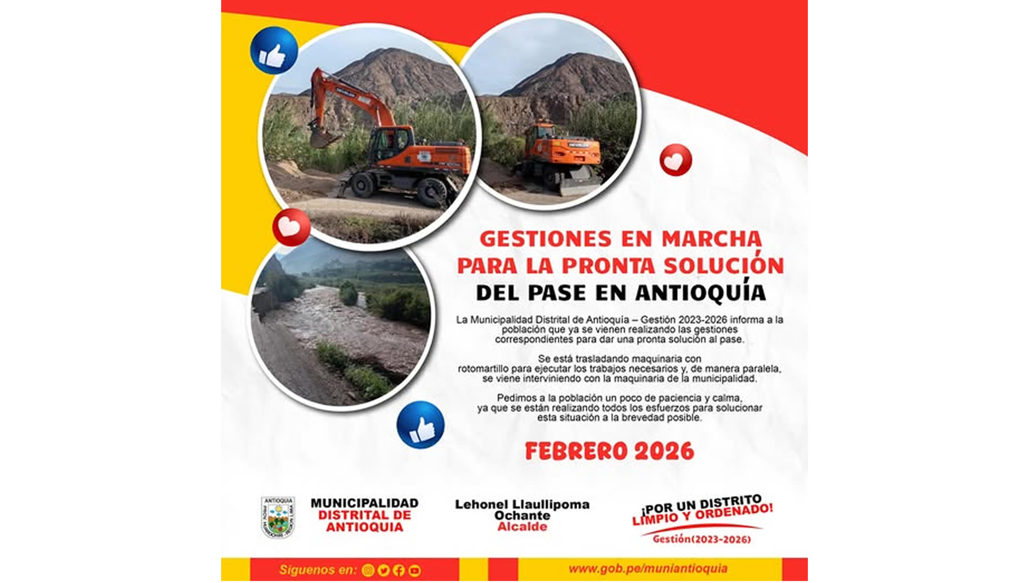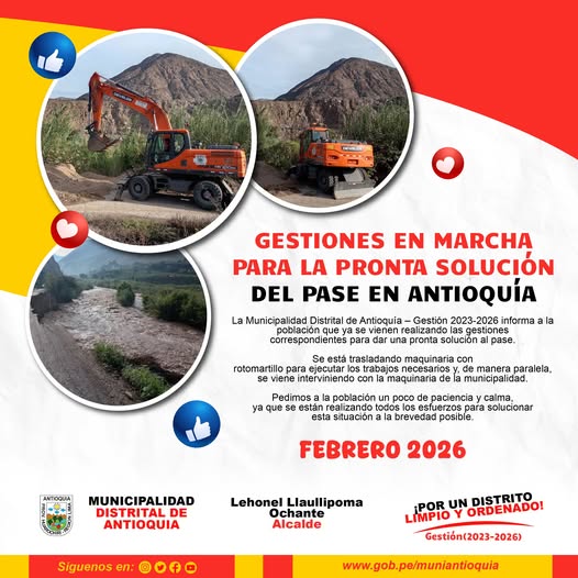 Actividades y Noticias Seguimos trabajando con fuerza por Antioquía febrero 27, 2026 Posted by leonid olivera 26 Feb Pronto restableceremos el pase . ¡Gracias por su paciencia y comprensión! #Antioquía #Gestión20232026 #TrabajandoPorElPueblo #ObrasEnAcción #CompromisoYTrabajo #MunicipalidadDeAntioquía