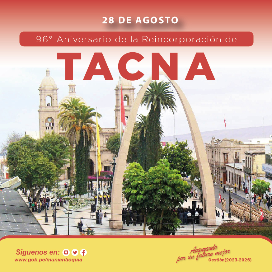 28 Ago Actividades y Noticias 28 de Agosto | Reincorporacíon de Tacna al Perú septiembre 8, 2025 By leonid olivera 0 comments 28 de Agosto | Reincorporacíon de Tacna al Perú Un día como hoy, en 1929, la histórica ciudad de Tacna volvió al seno de l...Continue reading