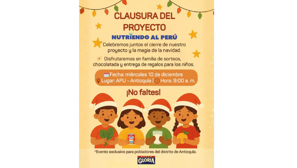 06 Dic Actividades y Noticias La Gran Clausura del Proyecto «NUTRIENDO AL PERÚ» febrero 11, 2026 By leonid 0 comments Municipalidad Distrital De Antioquía - 2023-2026 SE LES INVITA PARTICIPAR DE LA GRAN CLAUSURA DEL PROYECTO "NU...Continue reading