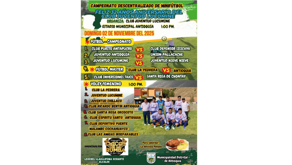 29 Oct Actividades y Noticias CAMPEONATO DESCENTRALIZADO DE MINIFÚTBOL «COPA ANTIOQUÍA 2025» noviembre 11, 2025 By leonid 0 comments CAMPEONATO DESCENTRALIZADO DE MINIFÚTBOL COPA ANTIOQUÍA 2025 La Municipalidad Distrital de Antioquía y el ...Continue reading