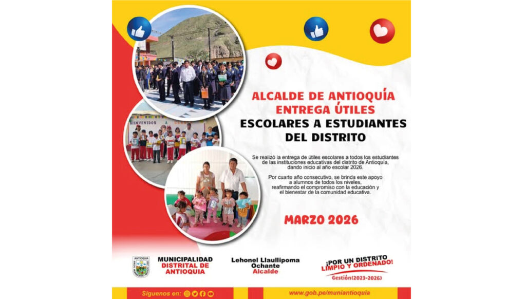 17 Mar Actividades y Noticias «Compromiso con la educación: Municipalidad de Antioquía entrega útiles escolares por cuarto año consecutivo» marzo 18, 2026 By leonid 0 comments ALCALDE DE ANTIOQUÍA HACE ENTREGA DE ÚTILES ESCOLARES A TODOS LOS ALUMNOS DE TODAS LAS I.E DEL DIST...Continue reading