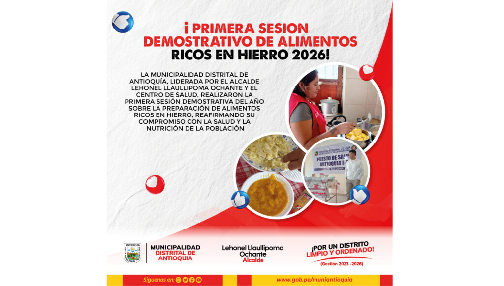 23 Feb Actividades y Noticias PRIMERA SESIÓN DEMOSTRATIVA DE ALIMENTOS RICOS EN HIERRO 2026 febrero 24, 2026 By leonid 0 comments La Municipalidad Distrital de Antioquía, liderada por el alcalde Leonel Llaullipoma Ochante, en articulación con ...Continue reading