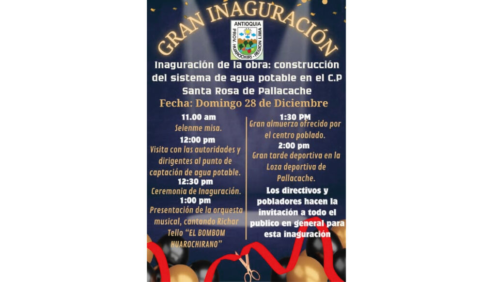 27 Dic Actividades y Noticias «GRAN INAGURACIÓN» febrero 11, 2026 By leonid 0 comments INAGURACIÓN DE LA OBRA: CONSTRUCCIÓN DEL SISTEMA DE AGUA POTABLE EN EL C.P SANTA ROSA DE PALLACACHE. FECHA: DOMINGO 28 DE DICI...Continue reading