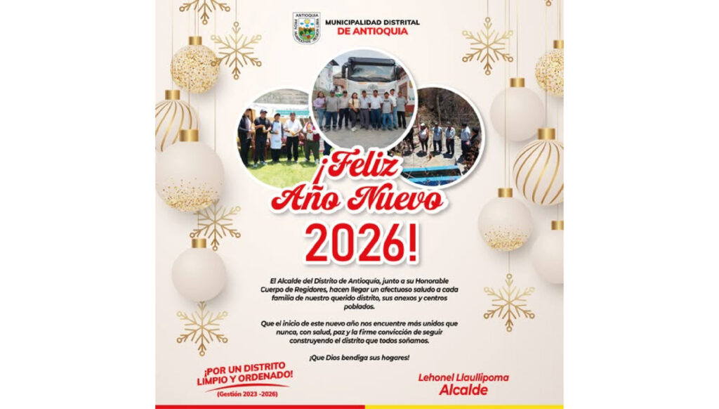 31 Dic Actividades y Noticias ¡FELIZ AÑO NUEVO 2026, ANTIOQUÍA! febrero 11, 2026 By leonid 0 comments Recibimos este nuevo año con la alegría de vivir en un distrito que crece día a día. Nuestro Alcalde Lehonel Llaullipoma y su H...Continue reading